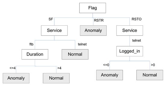Once the security features are ready to process, we design a tree-like model in order to make decisions in a data-driven intelligent intrusion detection system. In our model, we take into account the selected security features that are determined according to their importance score and ranking, rather than using all the features available in the given dataset. To design a tree-like model, we start from a root node. It breaks down a given training dataset into smaller subsets and an associated branch of the tree is incrementally created. To identify the attribute for the root node in each level, the “Gini Index” [] defined in the earlier section is used. An attribute with a lower Gini index is selected to incrementally develop the tree. Thus, we expand the tree by creating the required number of branches consisting of internal and leaf nodes and their connecting edges or arcs. Internal nodes are labelled with the security features selected earlier and each leaf node of the tree is labelled with a target class, either anomaly or normal in this work. The arcs of the tree coming from a node are labeled with each of the possible values of the relevant feature. The final result is a multi-level tree with a number of terminal or leaf nodes that includes anomaly or normal, as shown in Figure 3. Overall, our intrusion detection model IntruDTree takes into account mainly two properties, (i) reducing the feature dimensions by determining the feature importance and ranking, and (ii) to construct a multi-level tree by taking into account the selected important features. Figure 3 shows an example of an IntruDtree considering several features like , , , and their sample values in a given intrusion dataset.