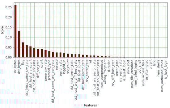 In order to answer the first question highlighted above, we show the importance score of each feature in the dataset and the significance of this score in our IntruDTree model in this experiment. For this, Figure 4 shows the calculated importance score for various features utilizing the given security dataset. If we observe this figure, we see that the calculated score of all features is not identical in a given dataset and may vary from feature-to-feature according to their effect on the target class. According to Figure 4, the feature has the highest score of (around ), whereas another feature has a score closer to the value 0 for this dataset. In order to show the comparative significance of each feature, Figure 4 shows their importance score values in a descending order, where the values are arranged from the largest to the smallest number. The higher the value, the more important the feature in our IntruDTree model. Thus, based on the score values, we can conclude that all the features in a given security dataset might not be similar significant to build a data-driven security model and a number of features comparatively with very low score values, less than a threshold t, can be reduced to simplify the dataset. In this experiment, we have selected all the features to build the model that satisfy the threshold value . As a result, we finally selected the top 14 features according to their importance score values shown in Table 2. Therefore, according to the results shown in Figure 4 and Table 2, we can conclude that the feature importance score and corresponding ranking strategies in our IntruDTree model is able to simplify the security dataset by reducing the negligible features. Consequently, it can help to build a generalized data-driven security model with a smaller number of security features.