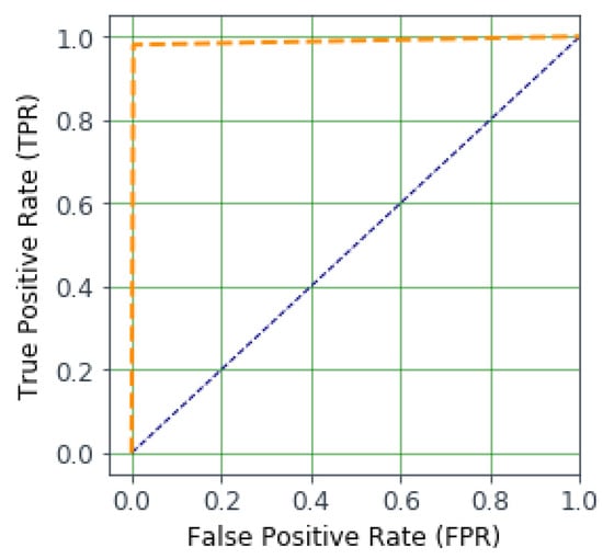 The ROC curve representing TPR (true positive rate) against FPR (false positive rate) of our IntruDTree model.
