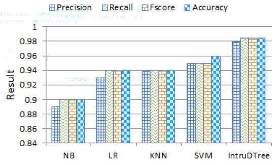To compare the effectiveness mentioned above, Figure 6 shows the relative comparison of precision, recall, fscore and accuracy, utilizing the security datasets discussed in earlier section. For each machine learning-based model, we use the same training and testing set of data, where 80% data are used to train the security model and the rest 20% data are used for testing the model. If we observe Figure 6, we see that our IntruDTree model has a better outcome than the traditional models. The reason is that in our IntruDTree model, we first determined the important features and then built the intrusion detection tree by taking into account the selected features. As a result, it minimizes the model variance and over-fitting issues, and generalizes the security model as well by considering the important features. Thus, the model is able not only to increase the prediction results for unseen test cases but also to minimize the computational complexity of the resultant data-driven security model. Therefore, according to the results shown in Figure 6 and the above experimental analysis, we can conclude that our IntruDTree model is more effective than the traditional machine learning classification based methods while analyzing the cybersecurity data.