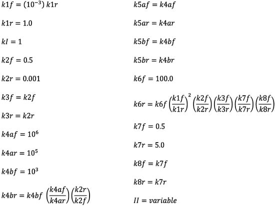 For the above theoretical model (R1)–(R8), the corresponding forward and reverse rate for each reaction are written as follows, in which concentrations are shown explicitly as functions of time: