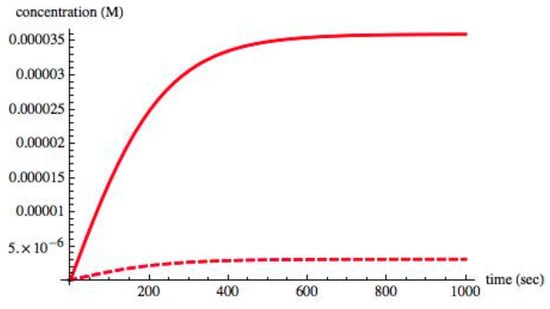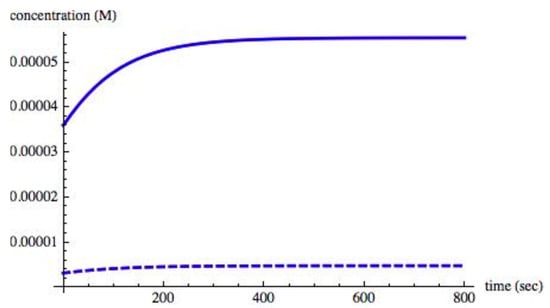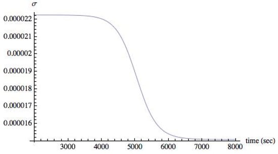 Rate of entropy production in an asymmetric state when II = 0.008. Units of σ are JK−1L−1s−1. As in Figure 3, steady state is reached at about 7000 s. Although it may appear that σ is approaching 0, it is not so; σ maintains a nonzero value at steady state after symmetry is broken.