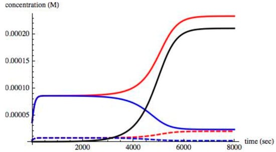 For values of II > 0.004, the small excess of 0.1% of XL in the initial concentration increased, thus driving all chiral species to an asymmetric state. A time evolution of the chiral species in an asymmetric state when II = 0.008 is shown in Figure 5.