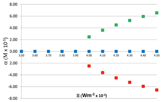 Dependence of α on II. Units of α are M and II are Wm−2. Steady-state values of α are plotted as a function of II. When II > IIC, α takes a positive (XL> XD, shown in green X) or negative (XL< XD, shown in red X) value, depending on the random perturbation that drives the system away from the unstable racemic state α = 0. The blue Xs show the symmetric branch which is unstable above the critical point. In the region II > IIC, α increases in a characteristically parabolic manner.