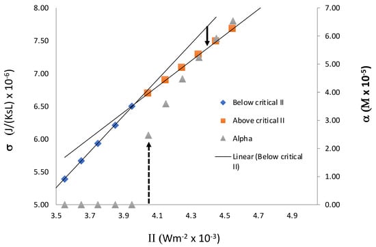 Rate of entropy production σ and α as a function of II. The critical value IIC = 0.0040. Beyond this point, α takes on nonzero values and there is a decrease in the slope of σ. Units of II are Wm−2. The dashed arrow indicates a transition from an unstable state, where α = 0, to a stable asymmetric state where α is nonzero. In the region II > IIC rate of entropy production of asymmetric state is lower than that of the symmetric state. The solid arrow shows that transition from an unstable symmetric state to a stable asymmetric state results in the lowering of σ, the rate of entropy production.