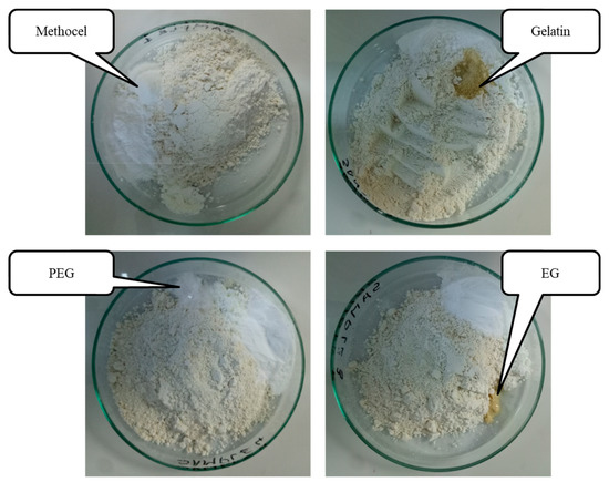 In this work, we used two inorganic raw materials (kaolin and calcium carbonate), one organic plasticizer (starch) and four different organic binders (methocel, gelatin, polyethylene glycol and ethylene glycol) (Figure 1). After mixing the kaolin (70%), calcium carbonate (25%), starch (2%) and organic binders (3%), 3.5 g of powder mixture was weighed and poured into the press mold with a diameter of 4 cm. Then, 6 tons of pressure was applied by manual hydraulic pressing (MSE Technology) to obtain circular ceramic membrane supports.