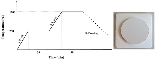 After the pressing step, pelleted samples were put into the sintering tables and were placed into the oven for sintering process. The samples were sintered at high temperature by using furnace (Protherm PLF 160/9) to improve the strength of the membrane supports. First, the temperature was increased (250 °C) at heating rate of 2 °C/min. Second, the temperature was increased to 1200 °C at heating rate of 5 °C/min. Finally, they were allowed to cool spontaneous up to room temperature. The sintering process are given in Figure 2.