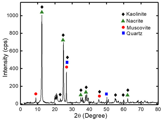 The composition of the kaolin powders was done by comparing the peak intensity position (2θ) in the sample X-ray diffraction contained in the Joint Committee for Powder Diffraction Standards (JCPDS). The peak intensity of the kaolin powders is shown in Figure 3. The powder consisted mainly of minerals associated with kaolinite, nacrite and other phases like muscovite and quartz. The intensities of this diffractogram showed that kaolinite and nacrite were the dominant phases where the peaks appear at 2θ (°) = 12.38°, 24.94° and 62.28°.