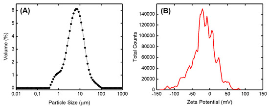 (A) Particle size distribution and (B) zeta potential distribution of kaolin powders.