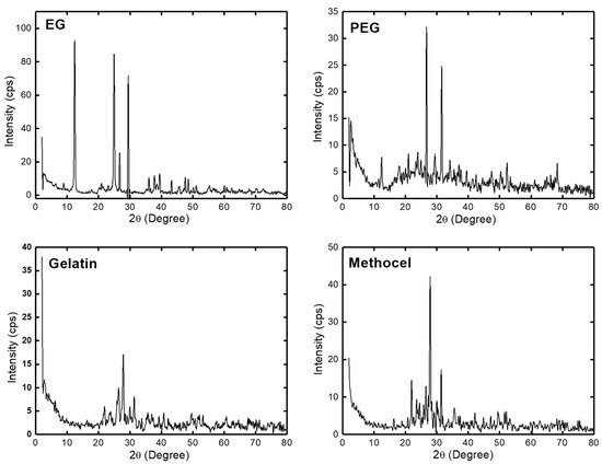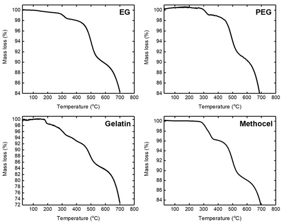 To understand all the physical and chemical transformations that occur in ceramic membrane support, thermal gravimetric analysis (TGA) proves to be the suitable technique. Figure 10 presents TGA of ceramic membrane supports prepared with different organic binders from room temperature to 700 °C at a heating rate of 10 °C/min. There were two weight losses corresponding to total weight of initial weight of samples (Figure 10). The first weight loss from 25 to 350 °C was due to removal of adsorbed water and organic binders (EG, PEG, gelatin, methocel). The second weight loss from 350 to 550 °C corresponds to the dehydroxylation of structural hydroxyl groups due to the transformation of kaolinite into metakaolinite. TGA results showed that the most mass loss was observed for the gelatin.