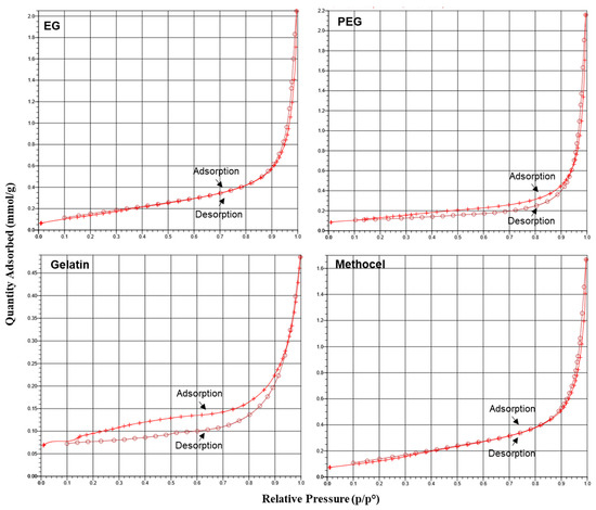 Figure 7 shows the complete adsorption and desorption curves with the nitrogen adsorption–desorption isotherm at 423 K for 90 min for all ceramic membrane supports prepared with different organic binders. The specific surface areas obtained from the BET method were calculated as 7.432, 10.403, 10.625 and 11.718 m²/g for gelatin, methocel, PEG and EG, respectively, which was valid within a relative pressure between 0.1–1.0. From the adsorption–desorption isotherm patterns, it could be interpreted that no hysteresis was observed and hence we could assume pores of the supports were cylindrical in shape.