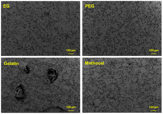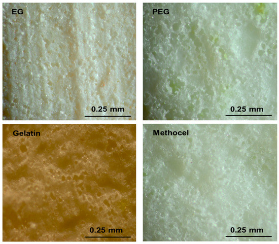 In this study, optical microscope and SEM imaging techniques were used to characterize the defects generated by different organic binders. The images obtained from the optical microscope showed that certain particles with different dimensions did not bind and certain pores were formed after sintering of ceramic membrane supports when organic materials were used as a binder (Figure 8). We can say that the incorporation of methocel reduced the vacuum fractions in the ceramic membrane support compared to other organic binder.