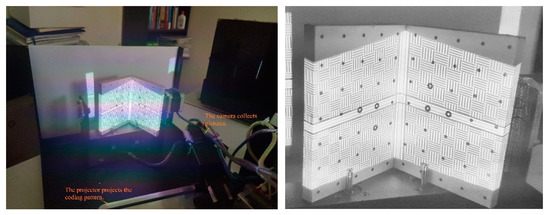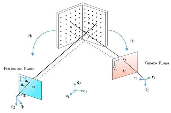 where refers to the parameter matrix of the camera, , and . is known as the internal parameter matrix for the projector, is the outer parameter matrix of the projector, which represents the rotation and translation relationship from the world coordinate system to the camera coordinate system.