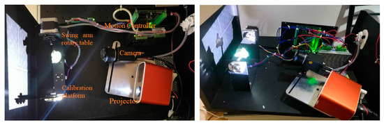 In Zhang’s calibration method based on the two-dimensional checkerboard plane target, the iterative calculation of camera parameters can be simplified by increasing the feature point size of the two-dimensional image, so as to achieve the purpose of improving the accuracy of the calibration camera. Zhang and Huang proposed a novel method that uses a projector to capture an image like a camera, and uses absolute phase to map camera pixels to projector pixels [6,7,8]. The selection of the camera pose for acquiring the calibration object image has a greater influence on the accuracy of calibration. Peng S. proposed a system to guide users through a simple graphical user interface (GUI) to move the camera to the most suitable posture for calibrating the camera [9]. The system can calculate the best pose for each new image acquired and add the latest information about the inherent parameters. A posture selection method suitable for interactive calibration was proposed by Rojtberg P [10]. This method can deduce a set of compact and robust calibration postures, which indeed avoids the calibration uncertainty caused by the singular calibration postures. In the above method, since the camera is required to accurately obtain the reflected light of the measured object when the encoded pattern is projected as the basis for solving the phase, the material and shape of the calibration plate will affect the final calibration result. Tian Miao et al. designed a black and white ring fan disc calibration template and calibrated the template design center circle using a 1/4 gap black circle in order to eliminate the influence of the calibration template rotation on the corner point sorting [11]. Fang Xu et al. introduced polar coordinates to represent the positional relationship of feature points in world coordinates, improving the convenience of multicamera calibration and the diversity of the reference calibration plates [12]. Jason Geng used a planer calibration plate, where the camera does not have to be pre-calibrated [13]. The camera and the projector are calibrated at the same time according to the same reference point on the calibration board, so as to avoid the error caused by camera calibration affecting the projector calibration. The disadvantage of this method is that it is susceptible to the effects of the noise generated by different surface areas due to the light intensity changing over time and the reflection parameters. The above method is relatively difficult to operate and the calibration accuracy is limited by the accuracy of the target. In addition, the image is fixed when the picture is captured, which is inconvenient for demonstration purposes and is susceptible to environmental factors.