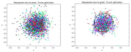 Each corner point is subjected to back projection imaging after applying the calibrated model, and the error magnitude can be visually represented by a reprojection error map [16,17]. Reprojection error refers to the error between the point projected theoretically and the measurement point on the image. The reprojection error graph reflects the accuracy of the calibration. In the calibration, we often use the reprojection error as the evaluation standard of the final calibration effect [18,19]. As can be seen from Figure 6, the backprojection error radius decreases to 0.2.