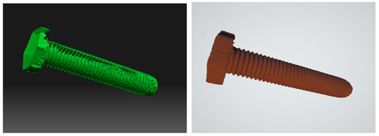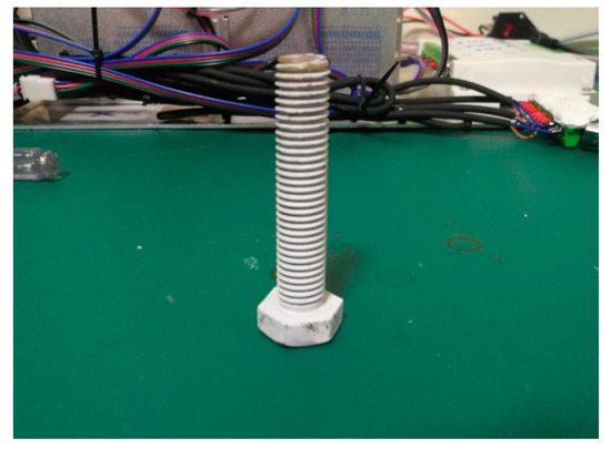 The original picture of the screw is shown in Figure 8. The reconstruction result obtained after calibration is better than the traditional calibration method. A smaller amount of reconstructed object information is lost, and the splicing success rate is higher. In Figure 9a, the inaccuracy of the calibration may make the subsequent splicing steps based on the feature points difficult, resulting in the lack of fused information after reconstruction. In Figure 9b, after the calibration of the stereo icon fixed plate used in the figure, the surface of the screw is smooth, no information is missing, and the visual effect is good. The comparison of reconstruction parameters is shown in Table 3. According to the table data, the accuracy reached 0.03 mm–0.05 mm.