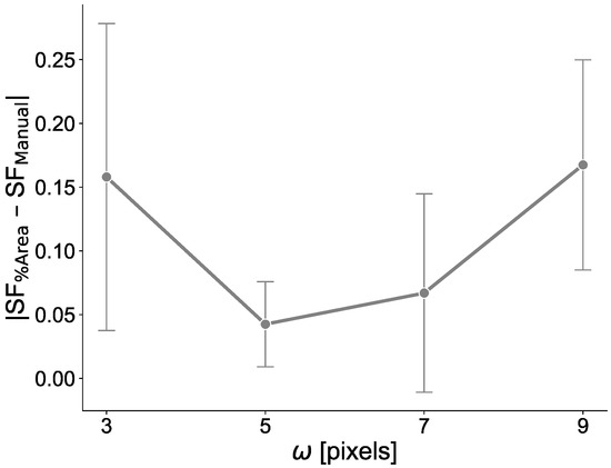 Since this is the first approach based on local descriptors for clonogenic assay evaluation, we investigated the size of the sliding window , composed of pixels, since it might affect the extracted textural information [56]. With this goal, we considered a calibration set consisting of 20 randomly selected images (5 for each cell line described in Section 3.1) and the values were tested in terms of the clonogenic assay evaluation performance, measured as the absolute error between the automatic area-based SF against the manual gold-standard measurement (i.e., ). More specifically, the extracted feature vectors were fed into the sFCM clustering (with the configuration ) and the area-based SF was calculated. The line plot (with the dots and error bars denoting the average absolute error and standard deviation for each setting, respectively) in Figure 4 depicts the trend of the results obtained by varying the parameter . The setting with achieved the best performance, obtaining both the lowest mean absolute error and standard deviation. As a final design choice, we consistently maintained the same size for both the sliding window (with pixels) and the squared neighborhood (with size pixels) employed in the spatial FCM clustering algorithm. Therefore, also supported by the literature about local feature extraction [56], we set pixels for all the experiments.