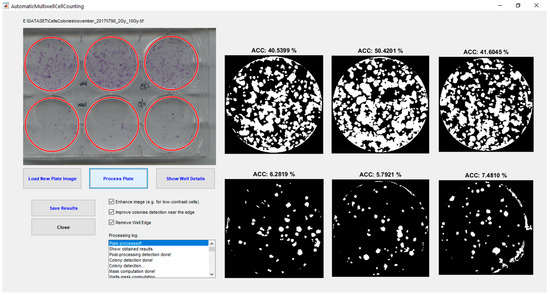 All the aforementioned approaches refer to the quantification of the number of colonies. Some research groups changed their point of view, passing from the CFU number to the area occupied by the colonies. In fact, these ‘alternative’ approaches calculate the Area Covered by Colony (ACC) for clonogenic quantification [6,36]. Area-based approaches represent a good alternative able to reduce the errors mentioned above and make it possible to provide an equivalent measure to the numerical manual colony count. In fact, experimental evidence obtained has shown how this measure is correlated with the colonies number. In particular, Guzmán et al. [36] developed an ImageJ plugin—named ‘ColonyArea’—for the analysis of focus formation assays, by processing 6- or 24-well images. Multi-well detection and separation was performed by means of a static mask obtained considering dimensions of the 6- or 24-well plate used. The approach was tested on T98G cells. To overcome possible problems due to the use of a fixed mask and incorrect positioning during acquisition, in [6] we proposed a fully automatic approach exploiting CHT [10,11] to automatically detect all wells on the processed multi-well plates, and local adaptive thresholding to quantify the ACC. Experimental tests were performed on MCF7 and MCF10A human cells. By using the CHT, no mask was needed for well detection, making it possible to have a fully automatic clonogenic quantification procedure.