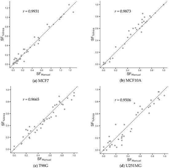 The SF values automatically obtained by considering the percentage of ACC were compared against the conventional measurement based on colony counting alone. In order to quantify the performance of the proposed multi-feature approach, the correlation between the manual numerical quantification of the clonogenic and the well ACC was evaluated. More specifically, the automated results were compared and correlated against SFs obtained by the manual counting procedure. Figure 8 depicts the scatter plots concerning the proposed automatic multi-feature SF (SF%Area) versus the manual colony counts (SFManual). Each diagram shows the correlation coefficients obtained on MCF7, MCF10, T98G, and U251MG cell cultures (by exploiting 79, 40, 40, and 40 samples, respectively) treated with different doses of radiation or cytotoxic agent. The experimental findings, in terms of coefficient values, showed a high level of correlation between multi-feature automatic approach and manual cell colony quantification for all the analyzed cell lines. More specifically: Figure 8a shows excellent results; in Figure 8b, the equality straight-line reveals a positive offset in the SF%Area measurements, by slightly over-estimating the manual colony counts SFManual (in approximately 52% of the cases for SF%Area > 0.40); on the contrary, Figure 8c is characterized by a moderate negative offset in the SF%Area measurements for 60% of the samples; considering SF%Area < 0.45, the results automatically obtained by MF2C3 on the U251MG cell line (Figure 8d) slightly over-estimate the manual measurements in about 62% of the samples. We can conclude that, considering the four different experimental data, no systematic error is found in terms of under-/over-estimation.