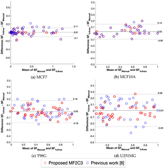 The agreement between the developed automatic area-based approaches and the manual colony counting measurement can be graphically represented by the Bland–Altman plot in Figure 9 for all the four analyzed cell types [60]. As a matter of fact, along with correlation coefficients, the Bland–Altman analysis better displays the data by plotting the pairwise difference between the measurements by the two methods against their mean. This representation allows us to investigate any possible relationship between the discrepancies and the ground-truth value. With more details, the 95% limits of agreement, estimated by mean difference 1.96 standard deviation of the differences, clearly help to detect any outliers (i.e., extreme observations). Figure 9 reveals that both MF2C3 and the previous work in [6] (denoted as red and blue circles, respectively) achieved reproducible results also considering the whole range of the SF measurements concerning the analyzed cell lines. In particular, MF2C3 consistently presents lower difference values (i.e., samples mostly concentrated along the mean line), as well as a smaller number of outliers (especially, in the case of the T98G and U251MG cell lines), compared to the thresholding-based approach in [6]. Confirming the findings from Figure 8, neither systematic discrepancy between the measurements nor bias can be observed.