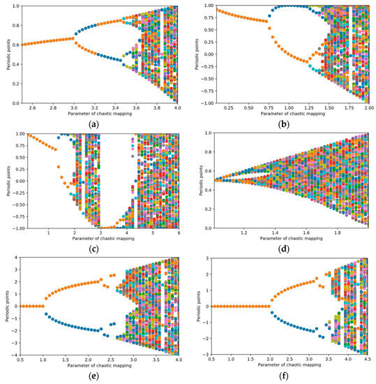 Bifurcation diagrams of the chaotic maps listed in Table 1: (a) Logistic map; (b) Square map; (c) Cosine map; (d) Tent map; (e) Sine map; (f) Circle map.