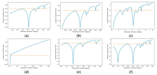 Lyapunov exponent plots of the chaotic maps listed in Table 1: (a) Logistic map; (b) Square map; (c) Cosine map; (d) Tent map; (e) Sine map; (f) Circle map.