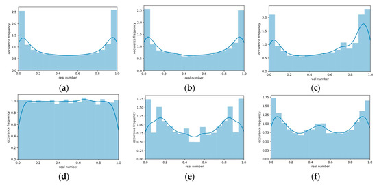 Histogram comparison of the relative occurrence frequency of random numbers generated by chaotic maps: (a) Logistic map; (b) Square map; (c) Cosine map; (d) Tent map; (e) Sine map; (f) Circle map.