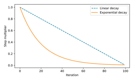 Here, denotes the step size at iteration , is the initial step size, and denotes the predefined total number of iterations, . A comparison of the step decay curve produced by (4) with the linear step decay used in the original FSS algorithm is shown in Figure 4.