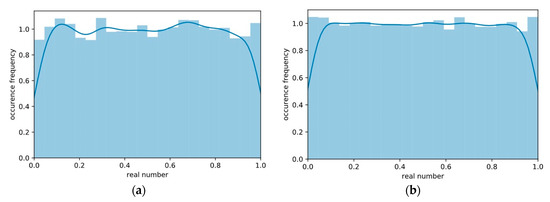 Histogram comparison of the relative occurrence frequency of the uniformly distributed pseudorandom numbers generated by (a) Mersenne Twister and (b) the chaotic tent map.