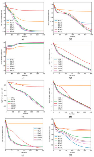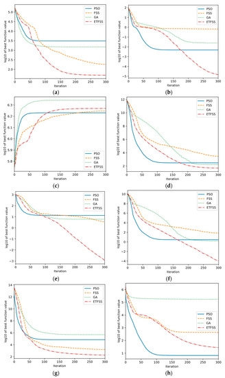 Convergence curves of PSO, FSS, GA, and ETFSS algorithms optimizing the 15-dimensional versions of test functions listed in Table 4: (a) (b) (c) (d) (e) (f) (g) (h) .