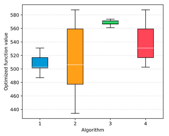 In Table 7, the ‘’ sign indicates that ETFSS outperforms the original algorithm, ‘’ denotes the opposite, and ‘’ indicates that no significant statistical differences exist between the two compared distributions. According to Table 7, the proposed ETFSS shows the best results in most of the considered optimization problems, but not the Styblinsky-Tang function. Despite the fact that generally GA outperforms ETFSS, according to Table 6, the best value obtained by ETFSS is more accurate when compared to that by GA. In order to further demonstrate this, we provide a boxplot of the respective optimized Styblinsky-Tang function values obtained by PSO, FSS, GA, and ETFSS. The boxplot is shown in Figure 8.
