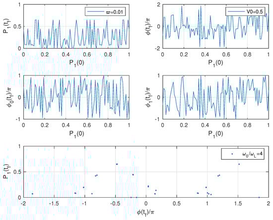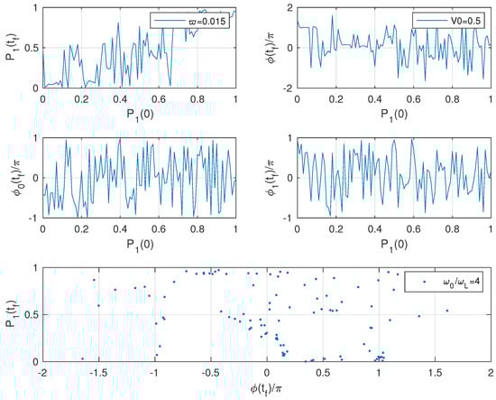 In Figure 10, we show the equivalent of Figure 1. The chaotic nature of the system is confirmed by the first two rows of plots. However, the last row is very surprising: the plot contains few stroboscopic points and not 100 as should be expected. Apparently the final phase difference and the final populations are correlated.