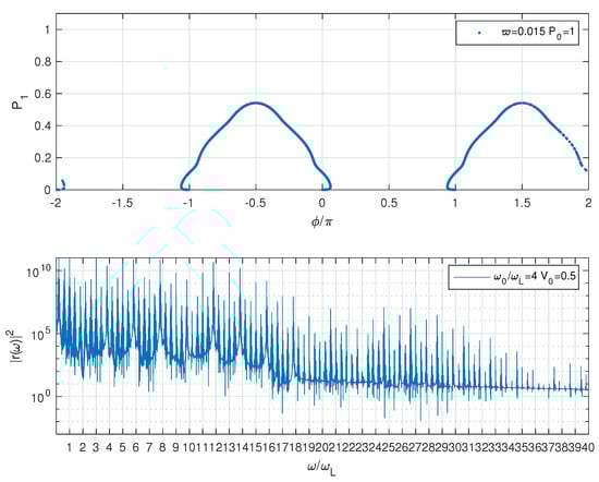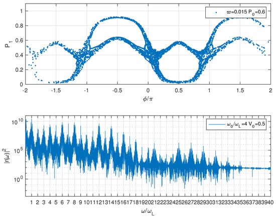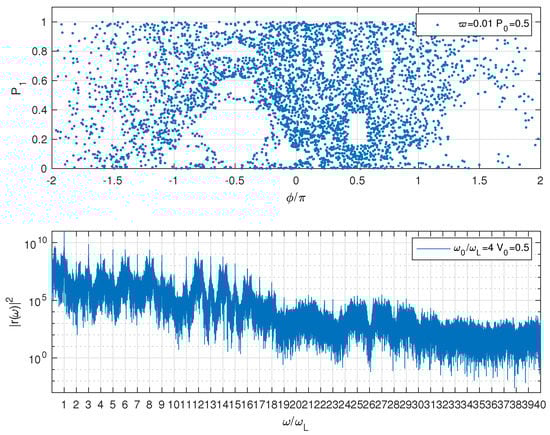 In Figure 9, we show vs. and the power spectrum of the dipole moment when the initial population is . The stroboscopic points are distributed in a random fashion and the power spectrum of the dipole moment is densely filled with unresolved lines. These features suggest that the evolution may be chaotic.