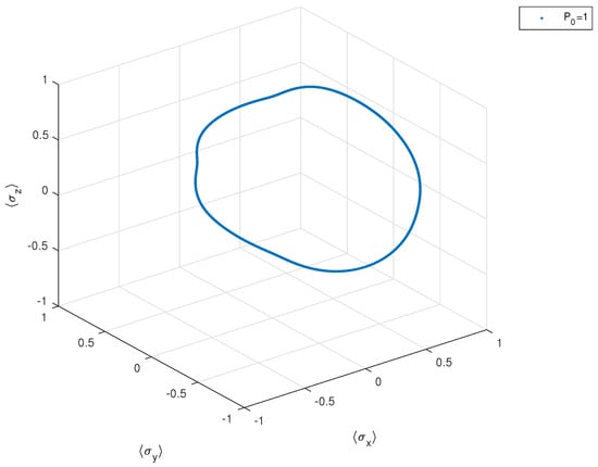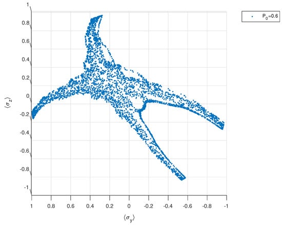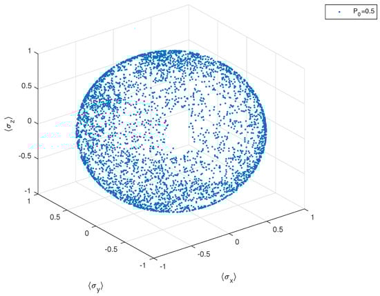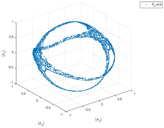 In Figure 8, we show the when the initial population of the ground state is . The filling of the Bloch surface by the stroboscopic points seems uniform and no pattern can be recognized. This is a flag of chaos.