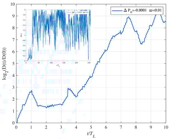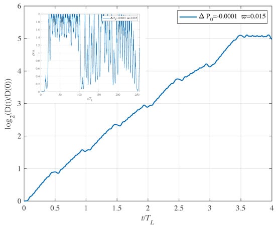 After these analyses, we resort again to the Lyapunov exponent to check that the second Hamiltonian introduces a bona fide chaotic evolution. In Figure 11, we show ; we notice an exponential divergency in the time interval 4–7.5 oc where (oc). In the full plot of , the maximum distance is reached after 20 oc and then fluctuates in a quick way not seen in the calculations for the first Hamiltonian. Again, we may say that the Lyapunov exponent confirms the qualitative conclusion that the motion is chaotic.