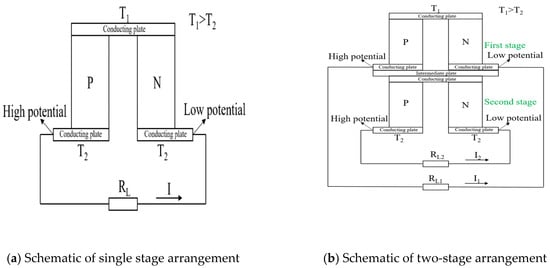 Among the three arrangements of the thermoelectric module, the single stage was baseline and the two-stage and single stage segmented arrangements were considered as modified cases of the single stage arrangement. Figure 1 shows the schematic diagrams of the single stage, two-stage, and single stage segmented arrangements of a thermoelectric module. A thermoelectric module with single stage arrangement comprised of one pair of p- and n-type thermoelectric legs and three conducting plates. The two-stage arrangement comprised of two single stage arrangements, positioned in the form of steps with an intermediate plate between them. The two pairs of thermoelectric legs in the two-stage arrangement were either made up of the same or different materials [17,18], whereas the single stage segmented arrangement was obtained by dividing the thermoelectric legs of the single stage arrangement into two equal halves. The upper half was named Segment 1 and the lower half Segment 2. Both segments were made of different materials [1,4].