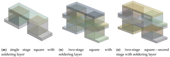 In order to predict temperature distribution, power, conversion efficiency, and thermal stress, a thermoelectric module with various configurations was investigated under four boundary conditions, temperatures of hot and cold junctions, and voltage conditions at high and low potential sides. These boundary conditions were applied to the four different faces, as shown in Figure 1a–c. Temperature of the cold junction was kept constant at 20 °C and voltage at the low potential side was fixed at 0 V. Temperature of the hot junction and voltage at the high potential were not constant for the various configurations of the thermoelectric module. The boundary conditions for the hot junction temperature and the high potential voltage of leg geometries, materials, and arrangements were shown in Table 2. The hot side temperature was varied with a step size of 50 °C and the high potential voltage with a step size of 0.001 V. The maximum temperatures for the hot junction of various configurations were decided based on the melting point temperature of the corresponding material of construction. The high potential voltages varied from 0 V to voltage value at which current and power became zero. During variations in high potential voltages, there existed an optimum voltage, which showed maximum power and maximum efficiency. Optimum voltage values were different with different configurations of the thermoelectric module because the variation ranges of the voltage were different for different configurations. In addition, the optimum voltage varied with the temperature difference for each configuration of the thermoelectric module. Maximum power and maximum efficiency were simulated at the optimum voltage for each configuration of the thermoelectric module at different temperature difference conditions. Apart from these four boundary conditions, the convection boundary condition with heat transfer coefficient of 1 × 10−6 W/mm2 °C was applied to all remaining faces of each configuration of the thermoelectric module. The heat transfer from the surfaces with the convection boundary condition to its surroundings was negligible.