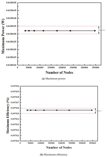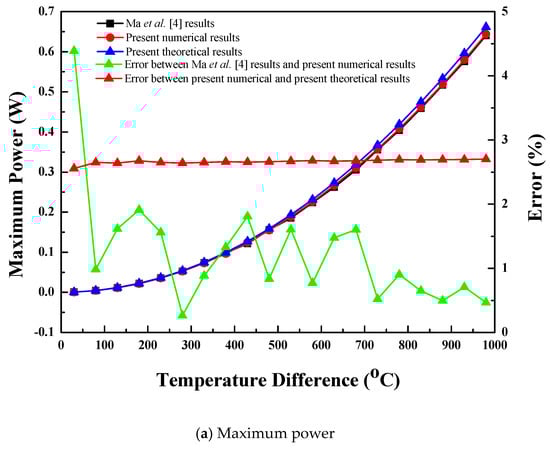 Optimum voltage at maximum power and efficiency exists for the given temperature difference condition. The current corresponding to the optimum voltage is called optimum current. Using the simulated optimum current value corresponding to the employed optimum voltage value, the maximum power based on the numerical approach was calculated using Equation (22) [13].