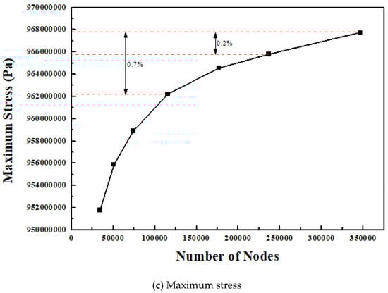 Mesh independency test for (a) maximum power, (b) maximum efficiency, and (c) maximum stress.