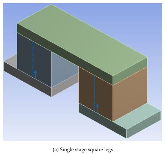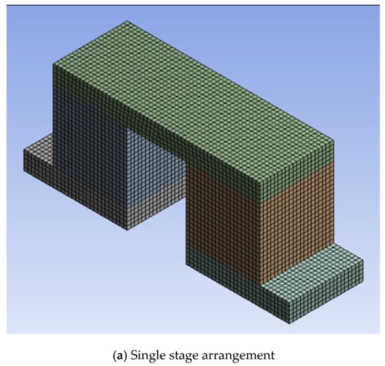 Mesh dependency of maximum power, maximum efficiency, and maximum stress for the single stage thermoelectric module constructed with square prism legs and SiGe material is shown in Figure 2a–c, respectively. Maximum power and maximum efficiency showed negligible variations within 0.00008% and 0.00002%, respectively, for the selected mesh numbers; however, maximum stress showed a variation within 0.7% above mesh number of 115,401. Hence, the mesh with 115,401 nodes was selected for the single stage thermoelectric module with square prism legs and SiGe material to evaluate maximum power, maximum efficiency, as well as maximum stress. Similarly, mesh dependency was conducted for the thermoelectric module with combinations of leg geometries, materials, and arrangements. The number of nodes for the same arrangement of thermoelectric module with materials and leg geometries are the same, but the number of nodes for varying arrangements are different. Therefore, the number of nodes for various combinations of leg geometries and materials after mesh dependency was selected as 115,401 for the single stage arrangement, 540,706 for the two-stage arrangement, and 242,138 for the single stage segmented arrangement. Maximum power, maximum efficiency, and maximum stress were converged as 1% above 115,401 (number of nodes) for the single stage arrangement, 540,706 for the two-stage arrangement, and 242,138 for the single stage segmented arrangement of the thermoelectric module with leg geometries and materials [28]. Meshing for the single stage, two-stage, and segmented arrangements of the thermoelectric module with square prism leg geometry is shown in Figure 3a–c, respectively.