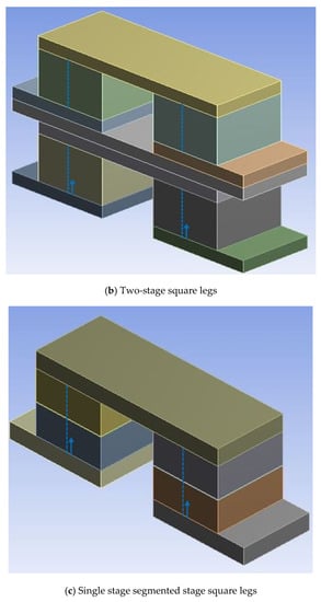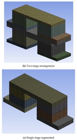 Meshing for (a) single stage, (b) two-stage, and (c) single stage segmented arrangements with square prism leg geometries.