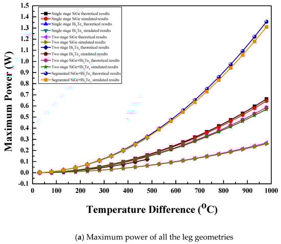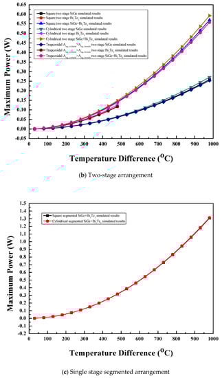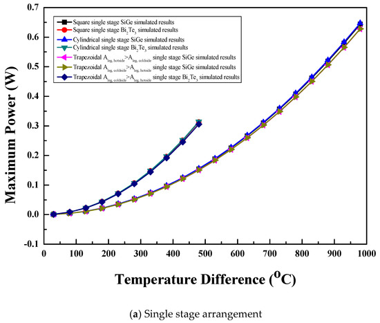 The comparison of maximum power with temperature difference for the single stage arrangement of the thermoelectric module with three leg geometries and two semiconductor materials is shown in Figure 7a. For the same material, leg geometry had no significant effect on maximum power because of the same internal resistance as well as the same optimum voltage values [1,6,10]. At the same temperature difference, the optimum voltage of the thermoelectric module was the same and leg geometry had the same volume and base area with equal internal resistance for all the legs. However, materials with high showed higher maximum power than those with lower [4,17]. Hence, for the same leg geometry, the Bi2Te3 material showed higher maximum power than the SiGe material at the same temperature difference. This behavior was observed up to a temperature difference of 480 °C as the Bi2Te3 material could not be operated at a higher temperature difference because operation above that temperature difference increased the hot side temperature above its melting point. Hence, beyond the temperature difference of 480 °C, the SiGe material showed an increase in maximum power with the highest value at the temperature difference of 980 °C. For all the materials and leg geometries with the single stage arrangement of the thermoelectric module, the maximum power increased with the temperature difference. All the leg geometries with the SiGe material showed maximum power of 0.65 W at a temperature difference of 980 °C, while all the leg geometries with the Bi2Te3 material showed maximum power of 0.31 W at a temperature difference of 480 °C.
