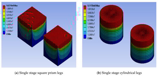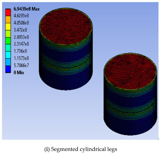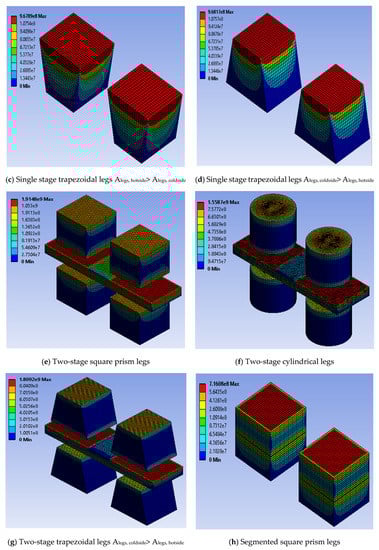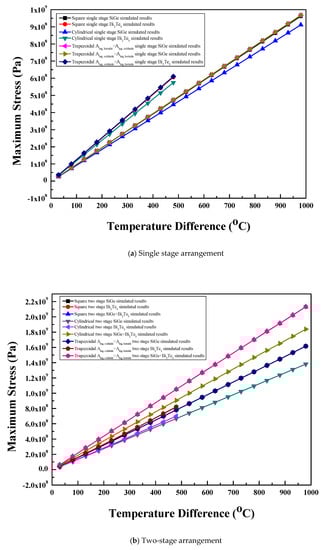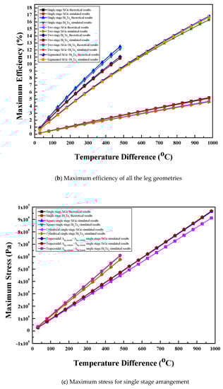 The maximum stress values were calculated theoretically using Equations (18)–(20). The calculated theoretical values of the maximum stress were compared with the corresponding predicted values. The comparison of theoretical and numerical results of maximum stress for the single stage arrangement of the thermoelectric module with three leg geometries and two materials is shown in Figure 5c. The equations show that the theoretical values of stress are not dependent on leg geometry; hence, the stress values are same for all leg geometries. However, different materials have different theoretical values of maximum stress. For the same material, the numerical stress values for cylindrical legs show closer agreement, whereas square prism legs as well as trapezoidal legs with two-area configurations show almost equal error with the corresponding theoretical stress values. For the same material, the numerically predicted maximum stress for all the leg geometries was found at ±7% with the corresponding theoretical stress with the entire temperature difference range.