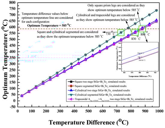 The single stage as well as two-stage arrangements with either SiGe or Bi2Te3 material were operated at maximum temperature differences of 980 °C and 480 °C, respectively, lower than the melting point temperature of SiGe or Bi2Te3 material. If the two-stage and segmented arrangements of the thermoelectric module with SiGe+Bi2Te3 material are operated at the maximum temperature difference of 980 °C, the operating temperature of SiGe material is below its melting point temperature, but the operating temperature of Bi2Te3 material is higher than its melting point temperature limit. Therefore, optimum temperature was introduced for the two-stage and segmented arrangements of the thermoelectric module with SiGe+Bi2Te3 material in order to operate them below the melting point temperature limit without failure. The optimum temperature is the hot junction temperature of the second stage for the two-stage arrangement of the thermoelectric module with SiGe+Bi2Te3 material and the interface temperature between two segments for the segmented arrangement of the thermoelectric module with SiGe+Bi2Te3 material [4,17]. The maximum value of the optimum temperature is the melting point temperature of Bi2Te3 material, which is around 585 °C. Figure 6 shows the optimum temperature values of the two-stage and segmented arrangements of the thermoelectric module with SiGe+Bi2Te3 material at various temperature difference conditions. The optimum temperature increases linearly with the temperature difference, as shown in the figure. As presented in the figure, in order to maintain optimum temperature of 585 °C or below, the two-stage arrangement with square prism legs are operated at the maximum temperature difference of 880 °C or lower, the two-stage arrangement with cylindrical and trapezoidal legs are operated at the maximum temperature difference of 830 °C or lower, and the segmented arrangement with square prism and cylindrical legs are operated at the maximum temperature difference of 730 °C or lower.