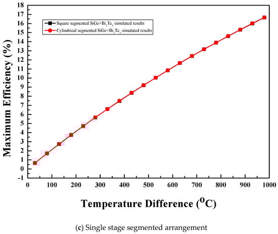 The maximum efficiency of the single stage segmented arrangement of the thermoelectric module with two leg geometries and combination of SiGe+Bi2Te3 material increased with the temperature difference. The maximum efficiency variation with the temperature difference is shown in Figure 8c. Like maximum power, the leg geometries had no effect on the maximum efficiency of the single stage segmented arrangement of the thermoelectric module with two leg geometries and combination of the SiGe+Bi2Te3 material [1,6,10]. At a temperature difference of 730 °C, the square prism and cylindrical legs showed maximum efficiency of 13.2%.