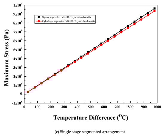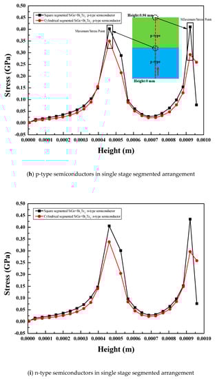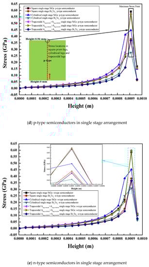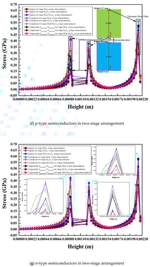 The comparison of maximum stress for the single stage, two-stage, and single stage segmented arrangements of the thermoelectric module with various leg geometries and materials is presented in this section. Stress variation along the height of various thermoelectric legs of different materials and for various arrangements is also presented.