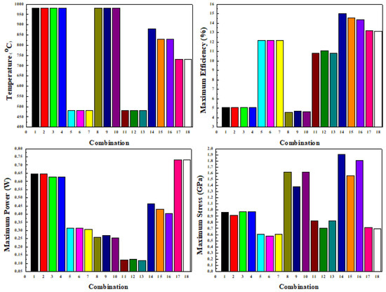 The maximum power values evaluated in the present study using the thermal electric solver were found to be of the corresponding maximum power values reported by Ma et al. [4]. Similarly, the maximum stress and centerline stress values evaluated numerically in the present study using the static structure solver were validated at with the corresponding maximum stress and centerline stress values reported by Al-Merbati et al. [11]. The maximum power and maximum stress evaluated using ANSYS codes in the present study were found to be in the error range of with the corresponding data of Ma et al. [4] and Al-Merbati et al. [11]. Hence, the application of numerical approach using the validated ANSYS codes is justified for the further analysis. Figure 4a,b show the maximum power and stress validation with the corresponding previous studies of Ma et al. [4] and Al-Merbati et al. [11].