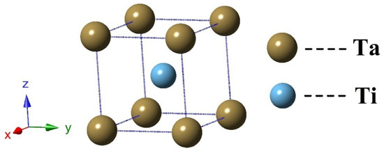 In this work, all DFT energy calculations are carried out via the Cambridge Serial Total Energy Package Program [18,19,20]. Herein, we adopt the generalized-gradient approximation (GGA) within the Perdew–Burke–Ernzerhof (PBE) as the exchange-correlation functional for calculations [21]. The pseudopotential is described by Vanderbilt-type ultrasoft pseudopotentials (USPP) to decide the interatomic interactions, which is determined by the shell electrons, namely, the valence electrons [22]. The valence electrons of Ti and Ta elements are 4s23d2 and 6s25d3, respectively. To ensure the convergence accuracy of the electronic calculations of the Ti0.5Ta0.5 alloy, the k-mesh in the Brillouin zone is set as 13 × 13 × 13, and the cutoff energy is optimized as 400 eV. The energy convergence criterion in the self-consistent calculation is optimized for 1.0 × 10-6 eV/atom. For Ti0.5Ta0.5 alloy, it has the space group of Im-3m, and Figure 1 displays the crystal structure. The algorithm of Broyden–Fletcher–Goldfarb–Shanno (BFGS) [23] is selected for optimizing the geometric configuration of the alloy in the pressure range of -10 to 50 GPa. Meanwhile, the Hellmann–Feyman force of each atom is accurate to 0.01 eV/Å.
