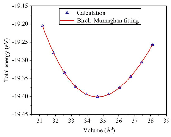 In the light of the set parameters, the adequate structural optimization of the unit cell is first performed to get the theoretical E–V data, herein, E denotes total energy and V indicates the volume of the unit cell, and we fit the E–V data to determine the equilibrium crystal structure of Ti0.5Ta0.5 alloy according to the Birch–Murnaghan equation of state, as depicted in Figure 2, in which the volume range is set to 0.9–1.1 V0, and each unit cell is optimized sufficiently. From the variation curve, the total energy gets the minimum value () when the volume is , which shows that the crystal structure reaches the most stable state when these physical parameters are taken, and then the theoretical prediction of corresponding lattice constant is obtained by derivation, namely, , where and represents the primitive cell volume and equilibrium lattice constant under and , respectively. Meanwhile, Table 1 lists the comparative results of the calculated lattice constant versus other data for Ti0.5Ta0.5 alloy, and it fits well with these available data, indicating the validity of the theoretical analysis method.