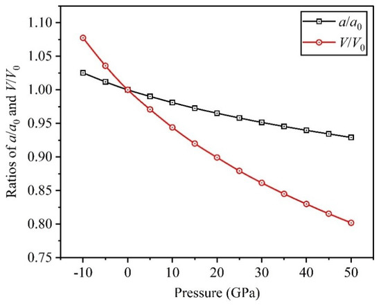 A series of structural optimizations are performed on the crystal structure of the Ti0.5Ta0.5 alloy under different applied pressures to get the corresponding volumes and equilibrium lattice constants, which are used to investigate the impacts of applied pressure on the unit cell volume and lattice constant. Subsequently, the dependencies of dimensionless ratios and on the applied pressure are obtained in the range of −10 to 50 GPa, where the negative pressure denotes the tension, as shown in Figure 3. From the variation curves, it can be found that the two ratios decrease when applied pressure increases and the descent speed for is significantly faster compared to , suggesting that applying pressure can greatly reduce interatomic distance, and then strengthen electron interactions between adjacent atoms in the Ti0.5Ta0.5 alloy.